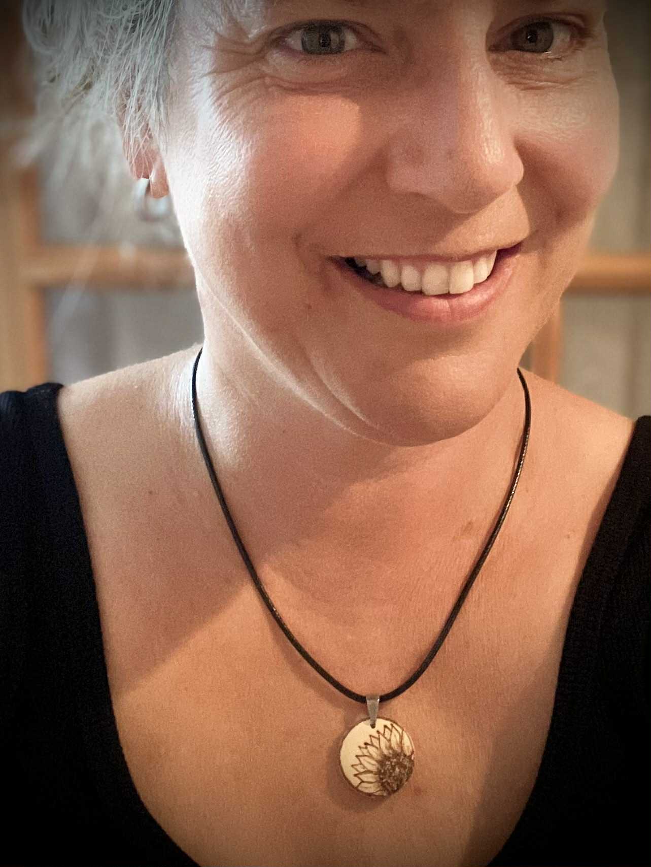 Création écoresponsable: pendentif en bois, pyrogravure à la main.