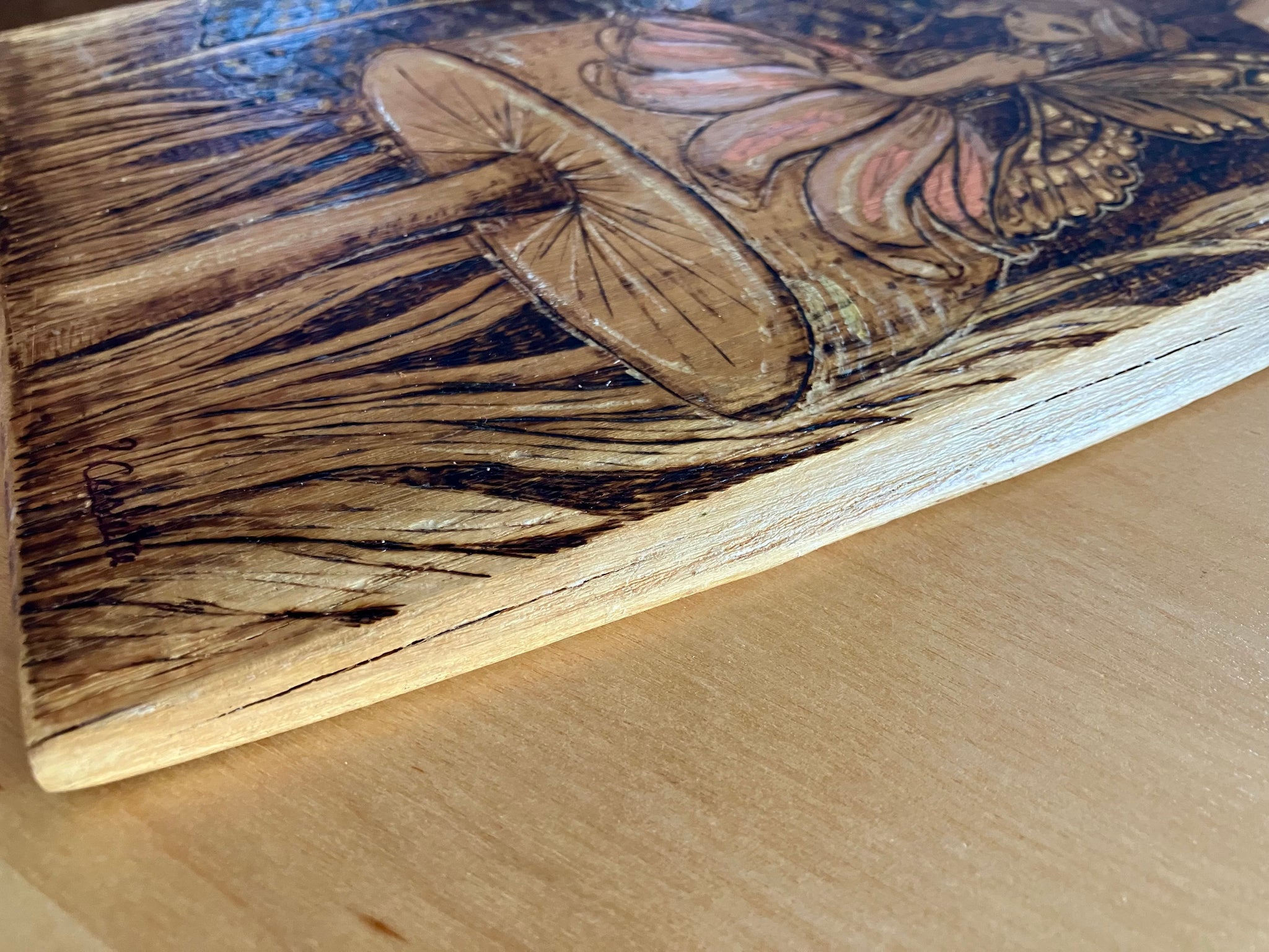 “Rosie” est une œuvre de pyrogravure sur bois brut. Au centre du tableau, cette fée assise sur un champignon, symbolise la connexion entre le monde féerique et la nature.