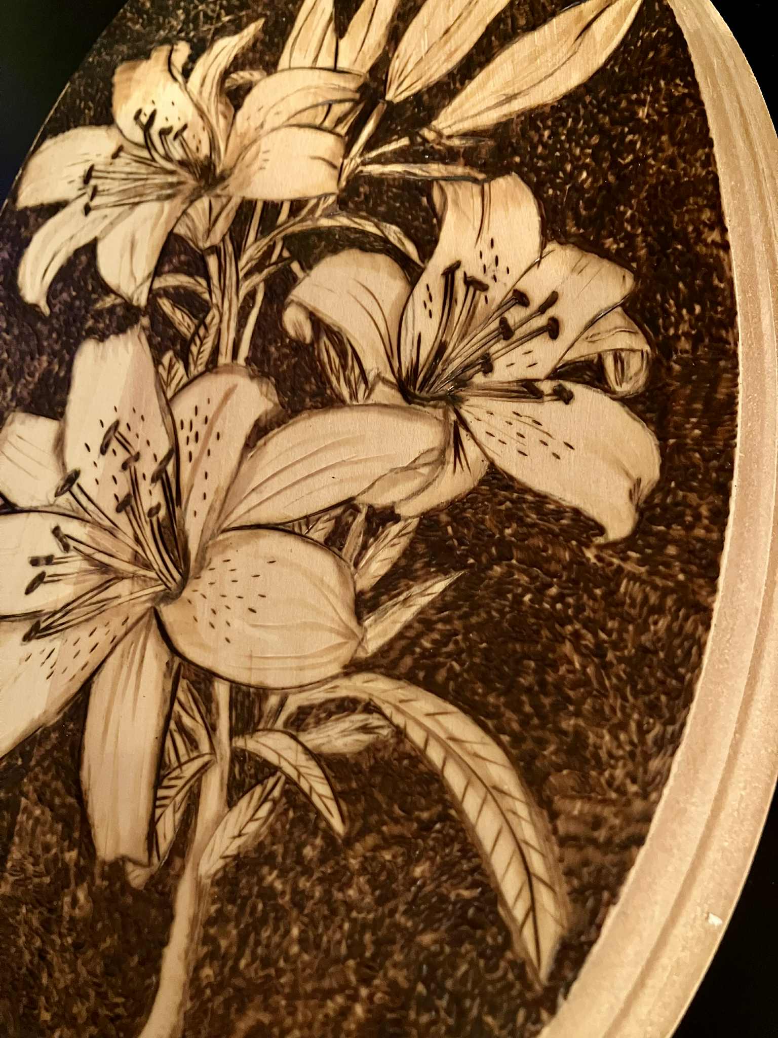 Création écoresponsable: bois, pyrogravure à la main, cire protectrice à base minérale.
