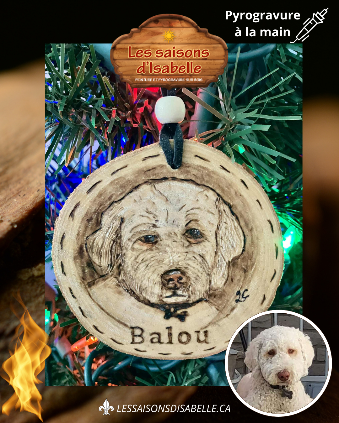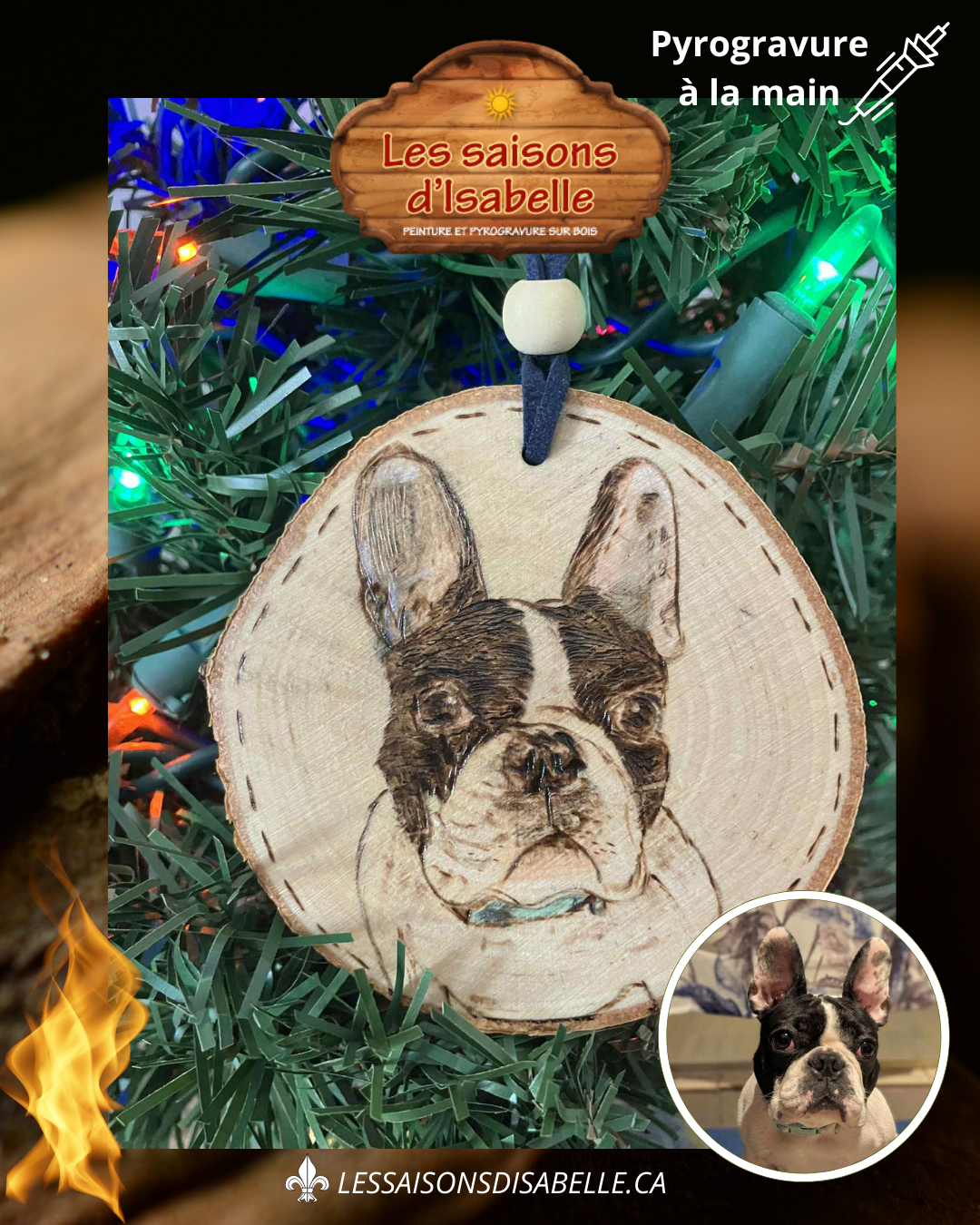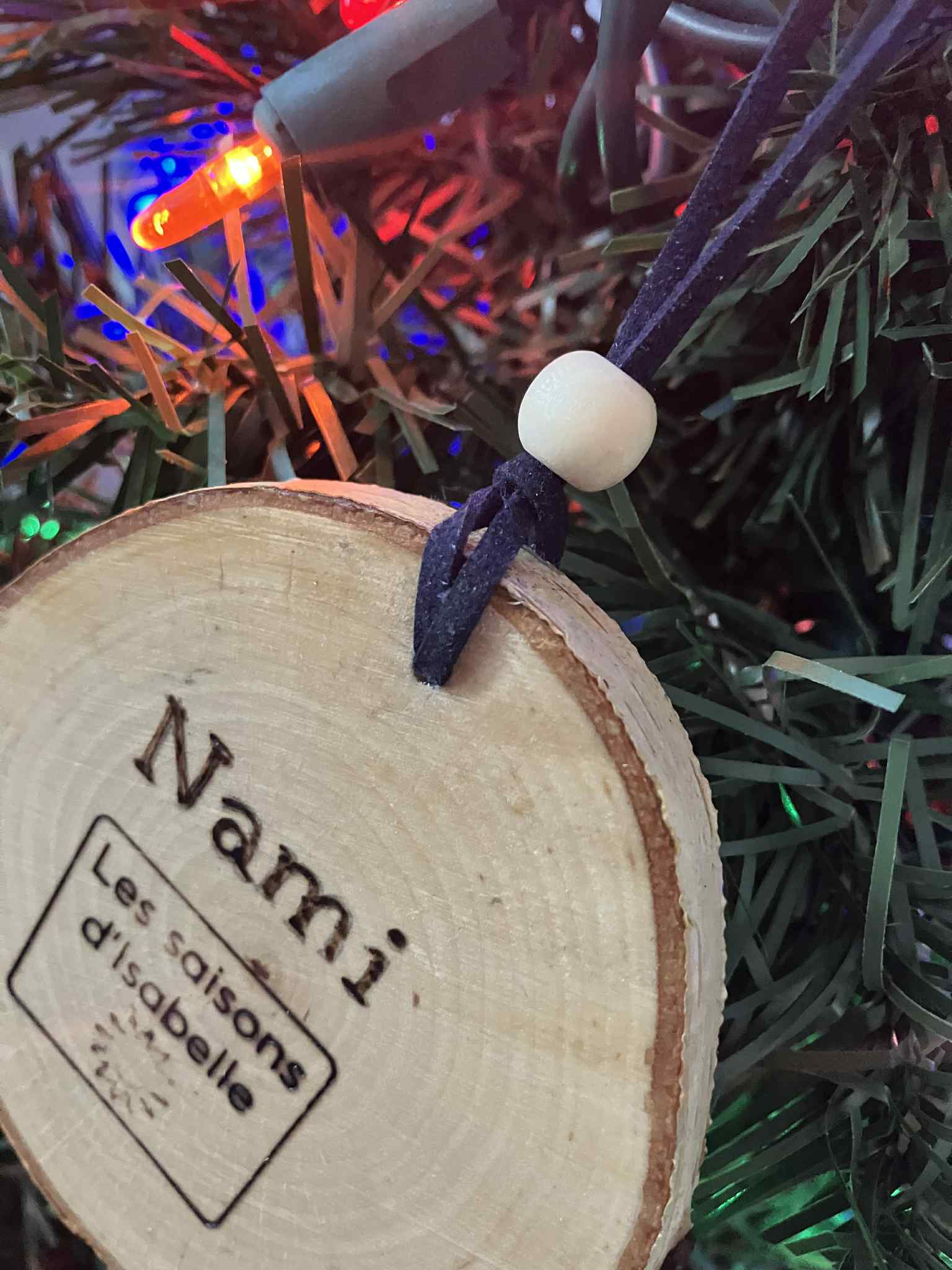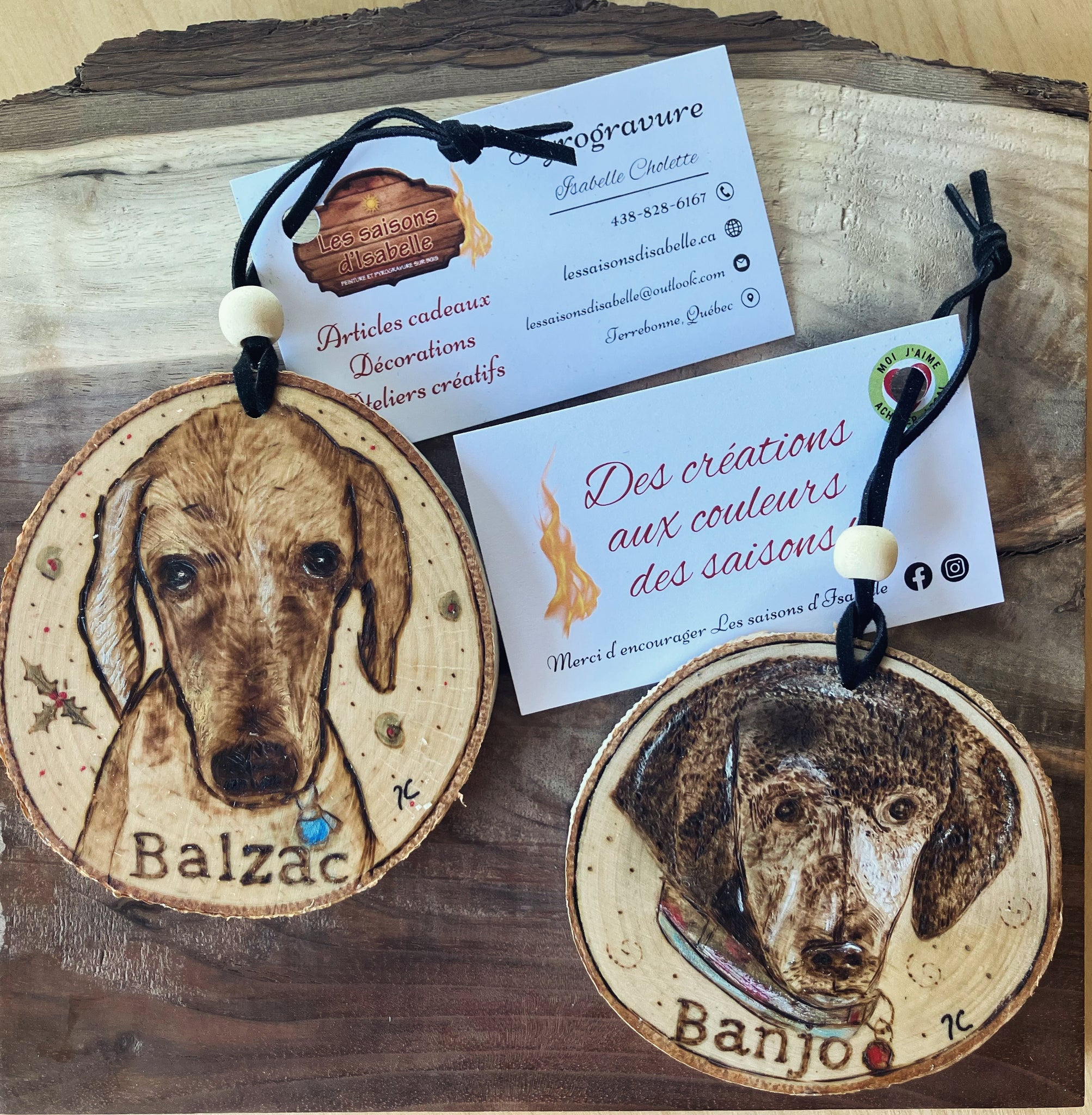 Confection écoresponsable: rondin de bouleau, pyrogravure à la main, cire protectrice à base minérale.