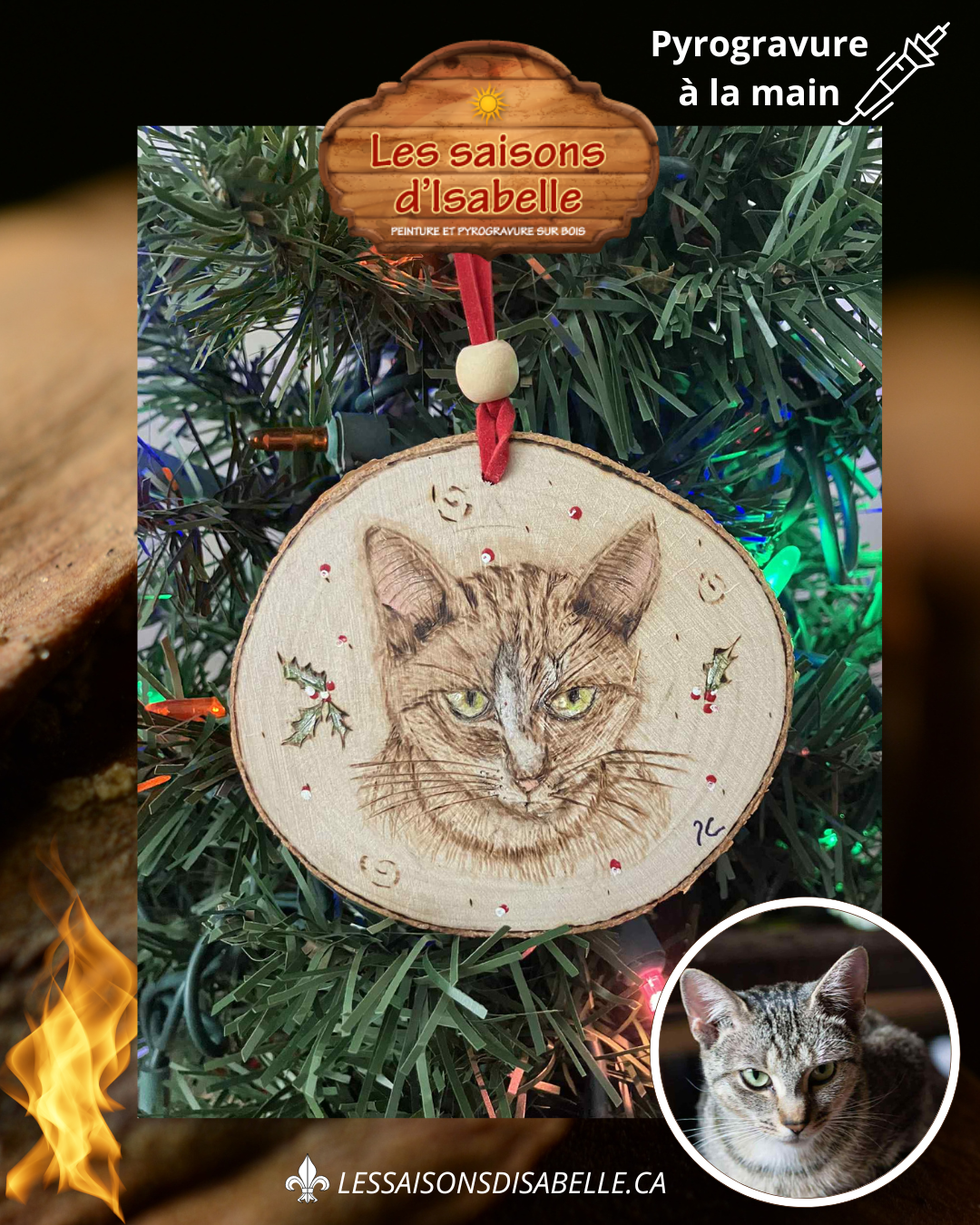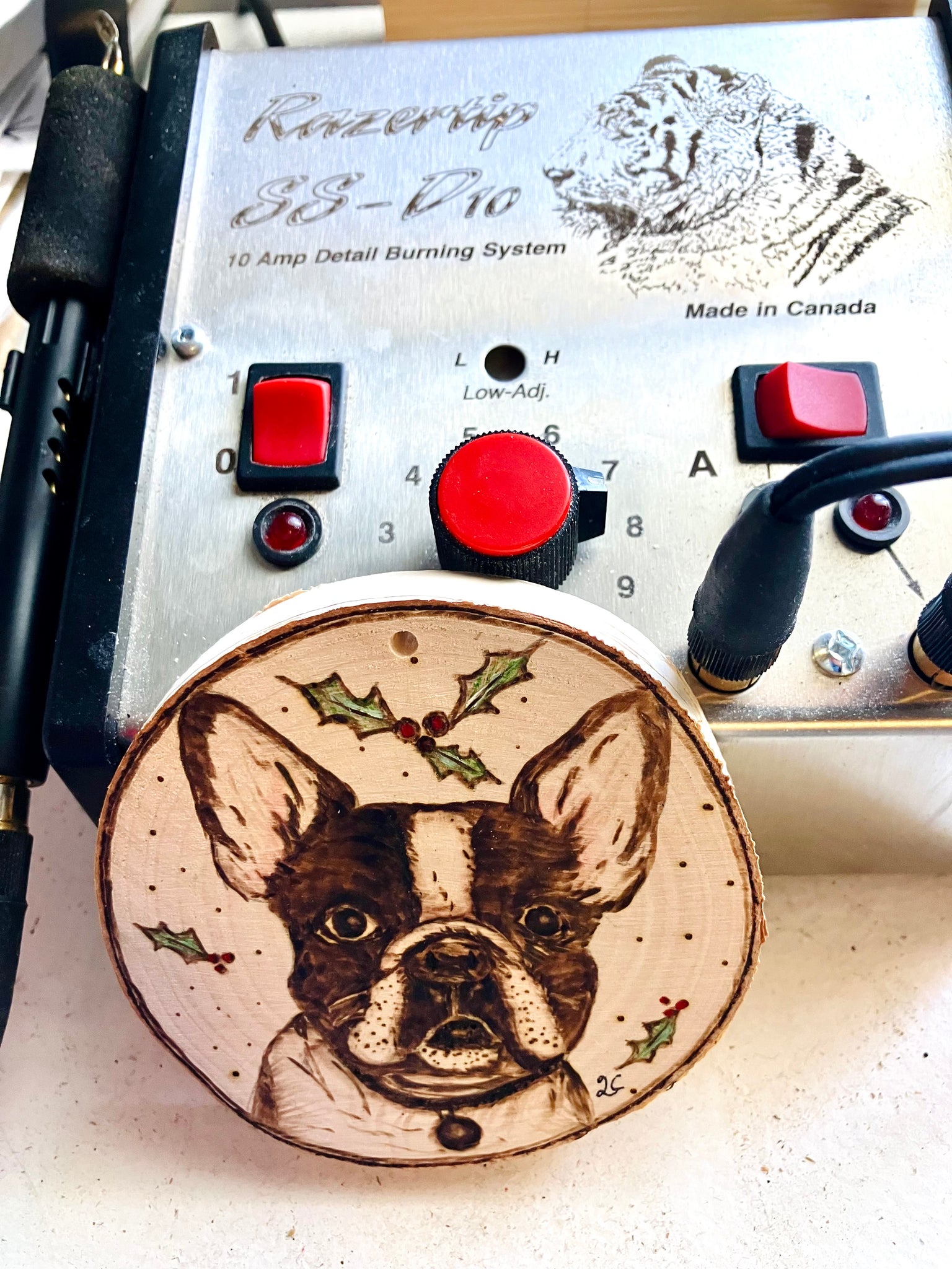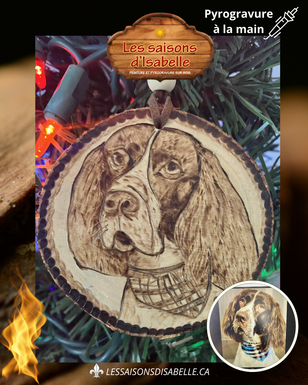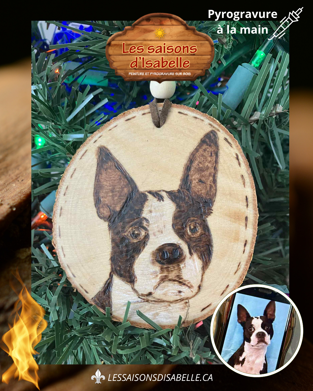Confection écoresponsable: rondin de bouleau, pyrogravure à la main, cire protectrice à base minérale.