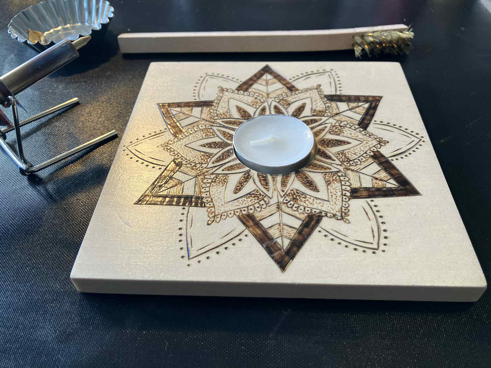 Création (2 h 30 - 3 h 00) : bougeoir mandalas, affiche, autres suggestions selon le bois disponible.